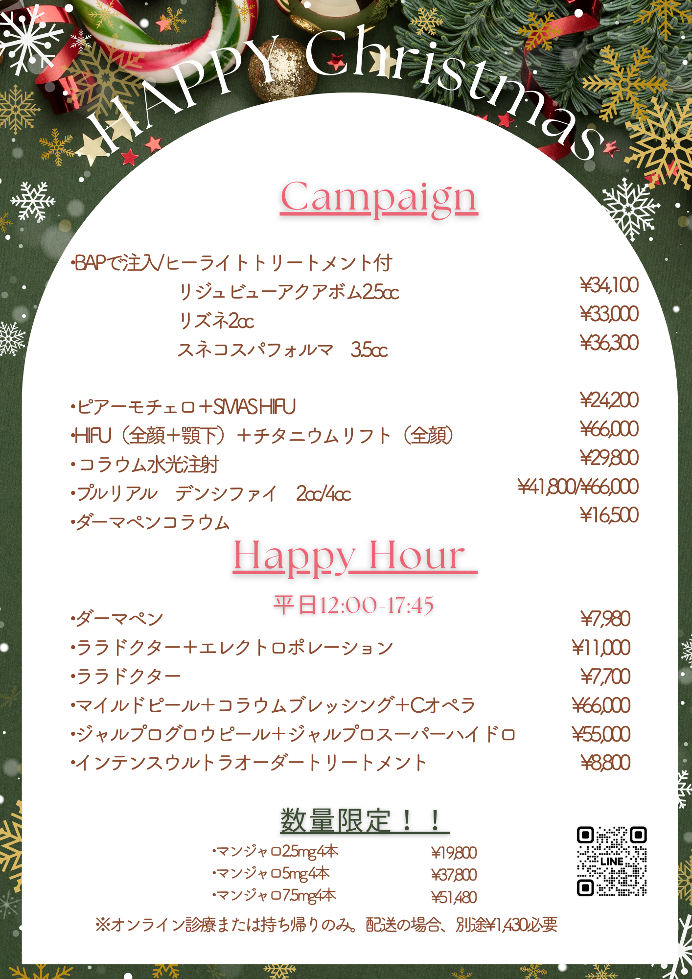 人気の注入・たるみ治療・美肌治療が、お得な特別価格で受けられる「クリスマスキャンペーン」を実施いたします。