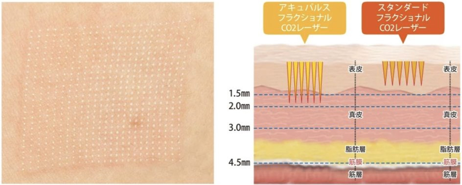 AcuPulseは従来のフラクショナルCO₂レーザーと比較し、より深い真皮層へアプローチしながらも、より細かく点状に照射することができるため、ダメージを抑えながらより大きな効果が期待できます。