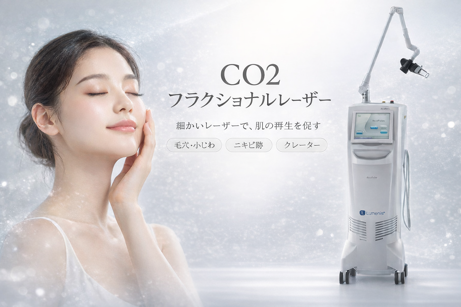 レーザーを小さな点状に照射し、肌に微細な穴をあけ、それが治癒する過程で真皮層のコラーゲンの修復と新生を促し、代謝をあげ、肌の表面を滑らかにする治療です。