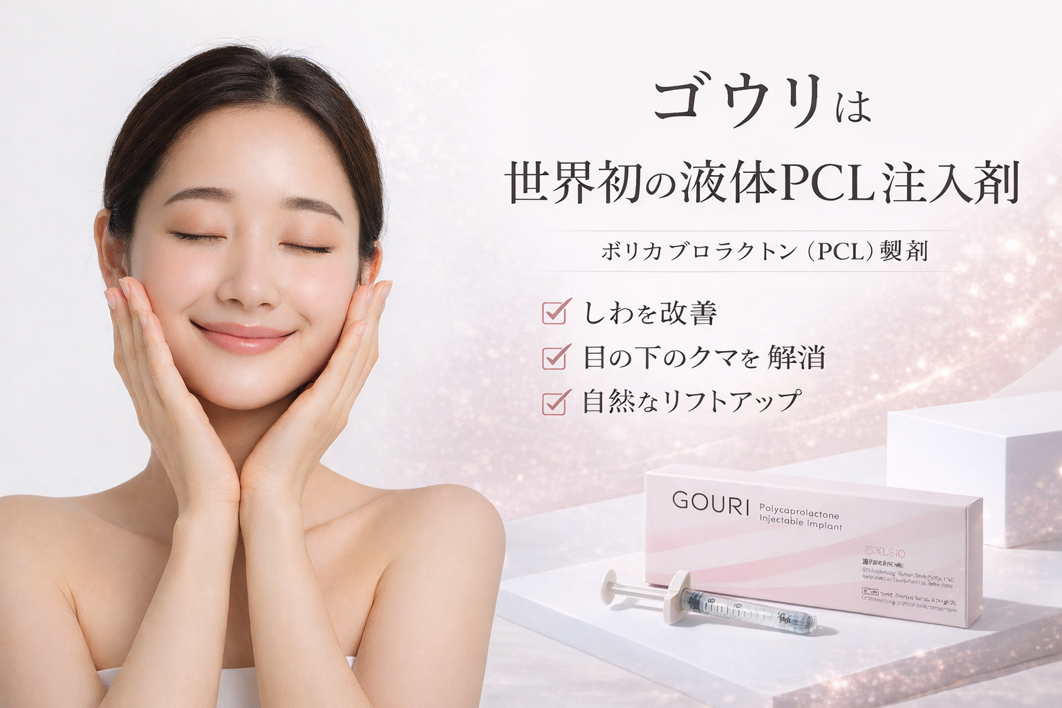 ゴウリ(GOURI)とは世界初の液状タイプのポリカプロラクトン(PCL)製剤です。ゴウリを肌に直接注入して皮膚組織を増強するとでしわの改善効果が期待できます。また、コラーゲンの増生をする作用もあるため、目の下のクマ改善や引き締め、自然なリフトアップ効果も期待できます。