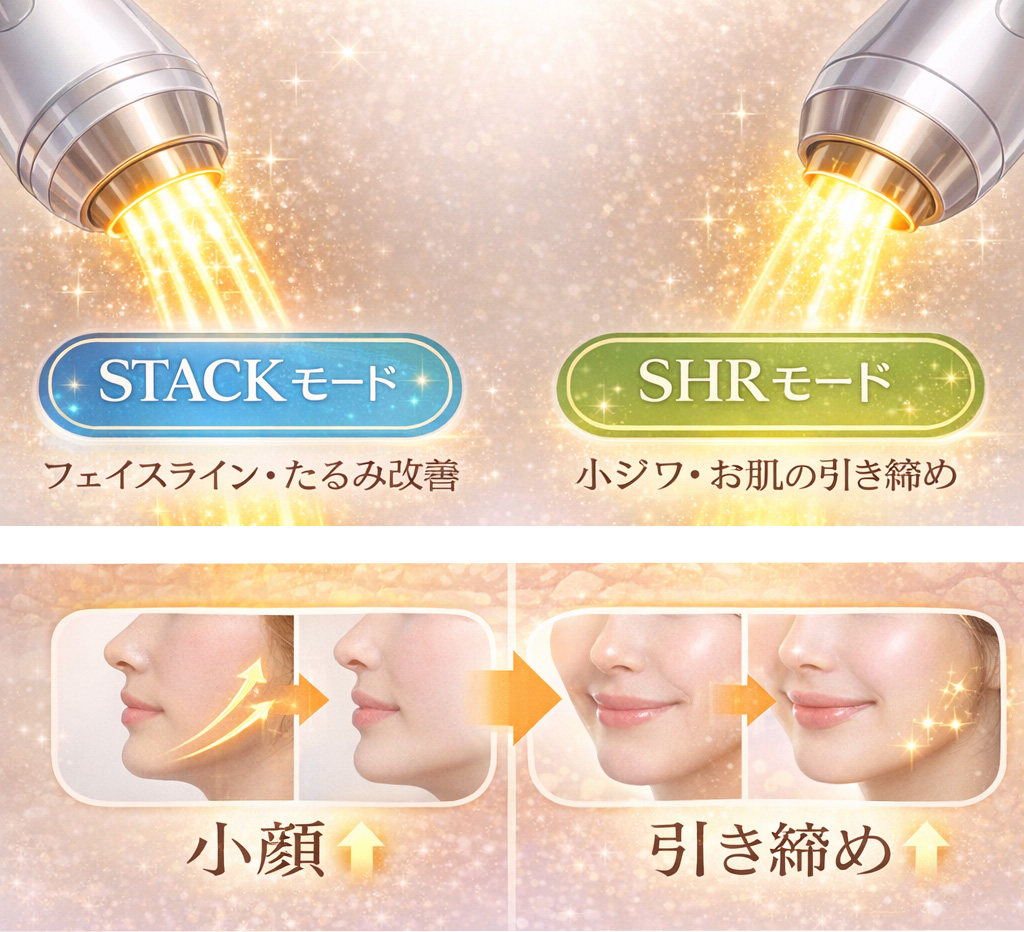 STACKモードは皮膚の厚さがある部位に効果的で、フェイスラインやたるみを改善します。