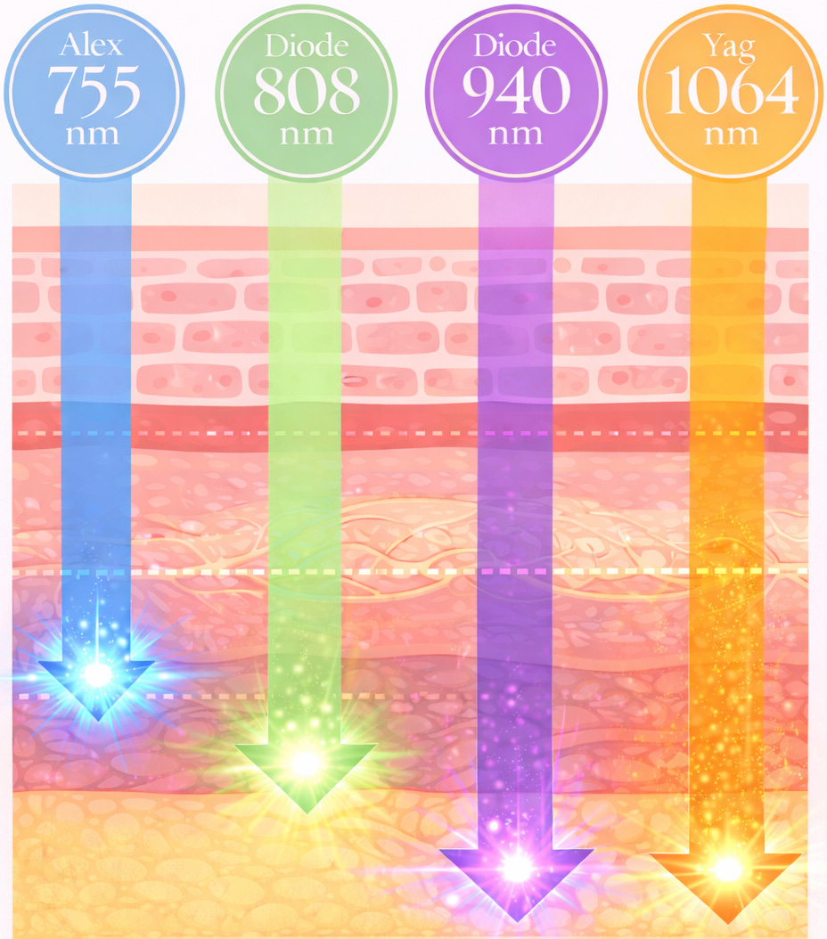 755nm・808nm・940nm・1064nmの4波長を同時に照射できることで、肌の4つの層を刺激し、リフトアップ、毛穴の改善、コラーゲン生成の促進、産毛の減毛、トーンアップなど様々なお悩みに1度の施術でアプローチできます。